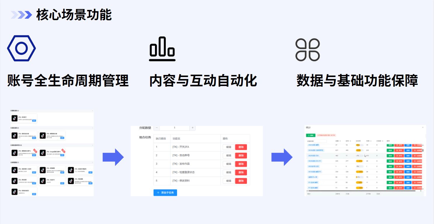 自动化运营的核心价值在于实现人力替代与成本优化,构建从账号管理到流量变现的完整闭环,大幅提升运营效率。其功能覆盖三大核心场景,为多账号运营提供全方位支撑:
