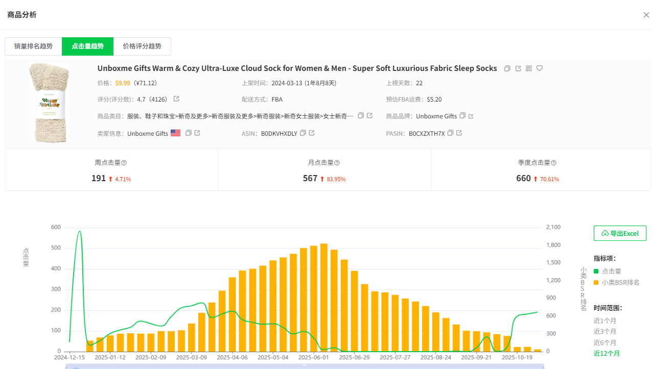 2、季节性因素:该产品为 “保暖袜”,属于季节性商品,随着秋冬临近,自然搜索量和点击量会因季节性需求上升而显著增长。