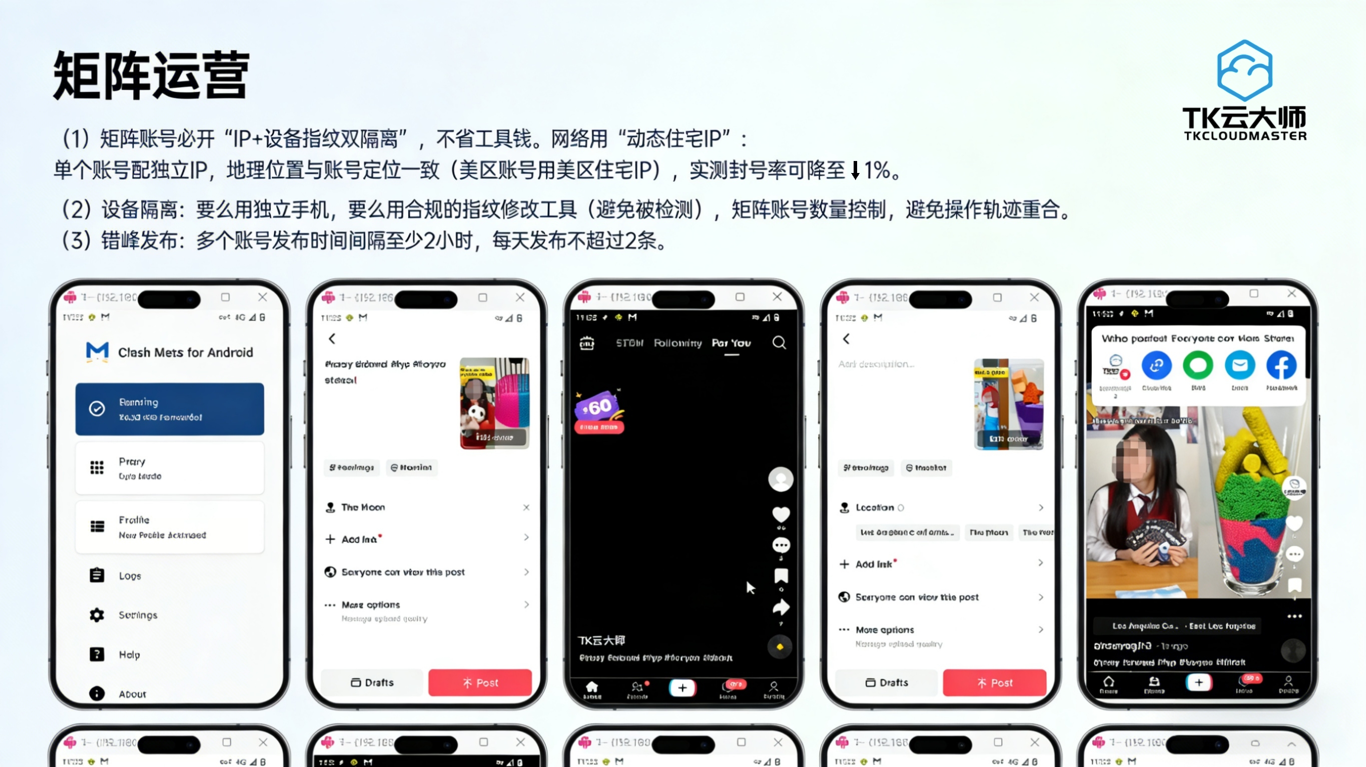 老运营的核心经验是“全面隔离”:每个账号必须配备独立的网络环境和设备指纹,从根源上切断关联线索。同时搭配错峰发布策略,避免账号行为出现规律性重合。