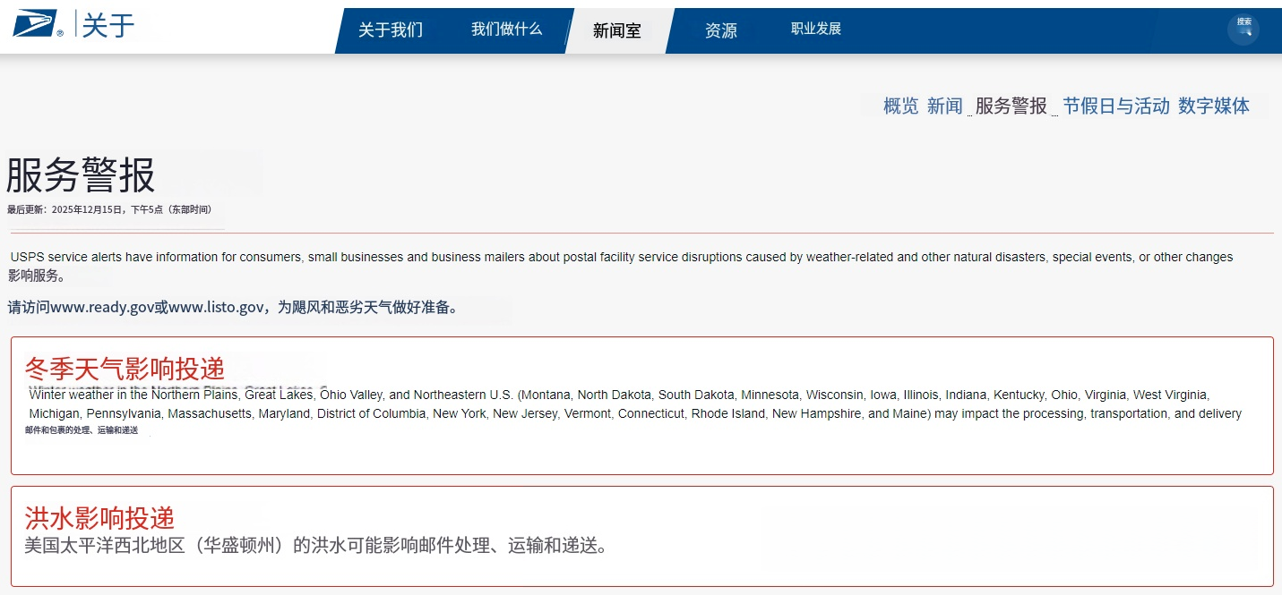 针对这一情况,USPS正式发布物流延误预警,表示邮件、包裹递送等主流服务均已受到波及,建议民众及商户提前规划寄送时间,避免因延误影响重要物品收发。