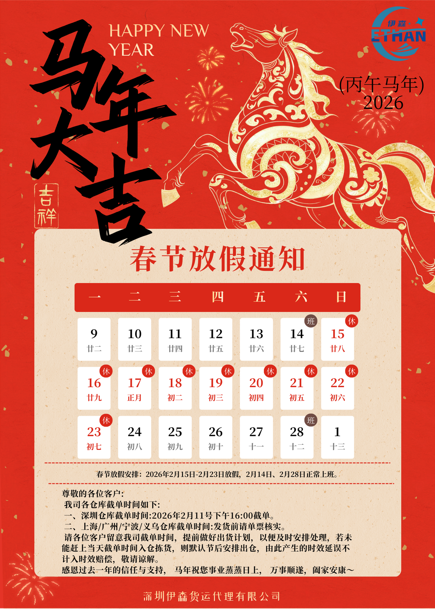 结合当前港口实况与春节假期安排,现将我司节前出货关键节点及春节放假事宜正式通知如下,敬请各位客户提前做好规划,年前有出货计划早点发货!避免特殊情况影响货物的发运!