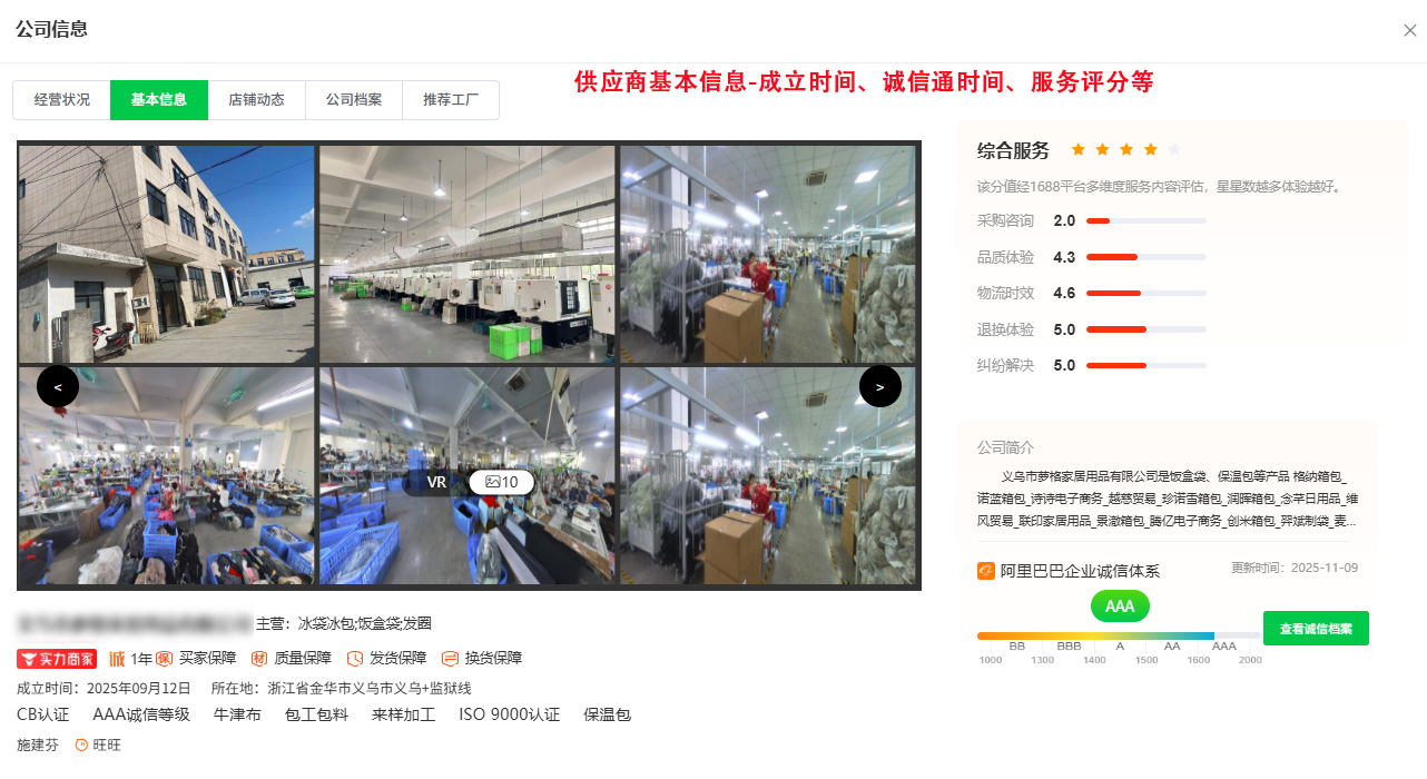 若店铺开店时间较短,且主体为个体工商户,店铺名称中常带有“电子商务”“商贸公司”“百货商贸”等字样,这类店铺很大概率就是中间商,这类商家通常缺乏自有库存,仅通过转单或跨平台代发的方式处理订单,货源稳定性较差。我们可以通过店雷达选品工具,在源头厂家筛选时,在卖家分析中查看供应商的基本信息,包括成立时间、诚信通时长、服务评分等,同时需要核对认证报告中的营业执照,是否一致。